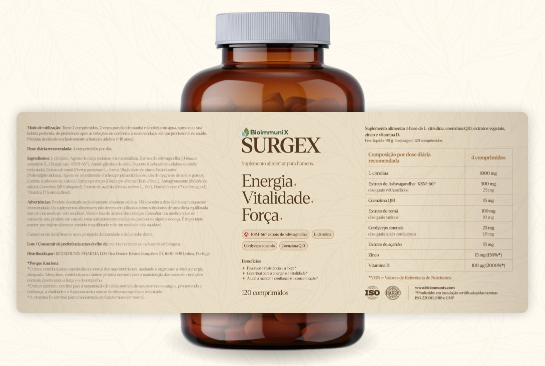 SURGEX, da Bioimmunix Wellness, é um suplemento avançado para a vitalidade masculina, formulado com ingredientes clinicamente investigados para auxiliar no equilíbrio da testosterona, energia física, desempenho sexual e autoconfiança no dia a dia. Criado para homens modernos maiores de 18 anos, SURGEX oferece um apoio direcionado para o ajudar a ter o melhor desempenho, dia após dia.